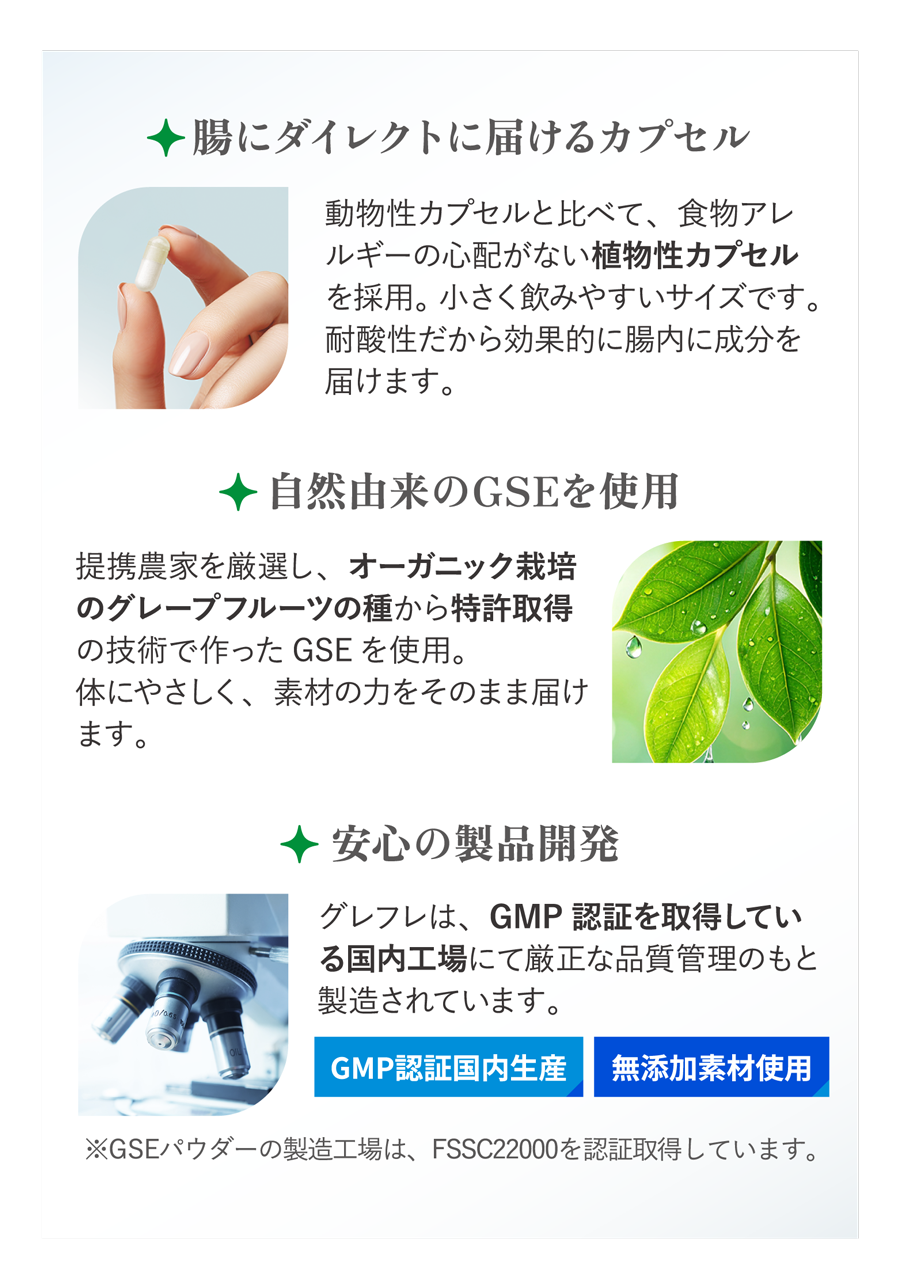 グレフレ 除菌・抗菌分野の研究および商品開発に長年携わるスペシャリスト。人や動物にやさしく、かつ高い抗菌・消臭力をもつ素材を追求する中で、グレープフルーツ種子抽出エキス(GSE)の可能性にいち早く着目。除菌スプレーをはじめ、大手メーカーと共同でGSEを繊維に練り込んだ抗菌・消臭ストッキングの開発にも携わるなど、幅広い分野で実用化を牽引してきました。本製品では、これまでの研究および商品開発の知見をもとに監修を担当しています。